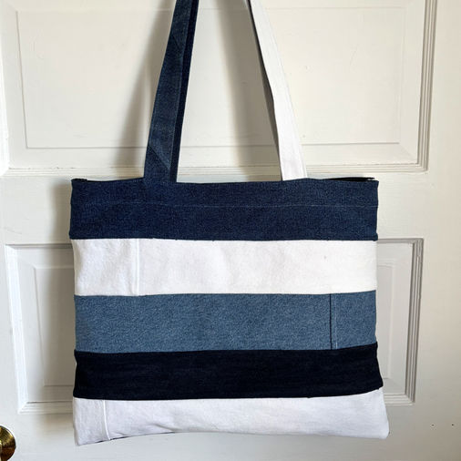 Crafted from reclaimed jeans, this tote gives classic denim a fresh, one-of-a-kind style. Each piece is unique, combining sustainability with timeless design.